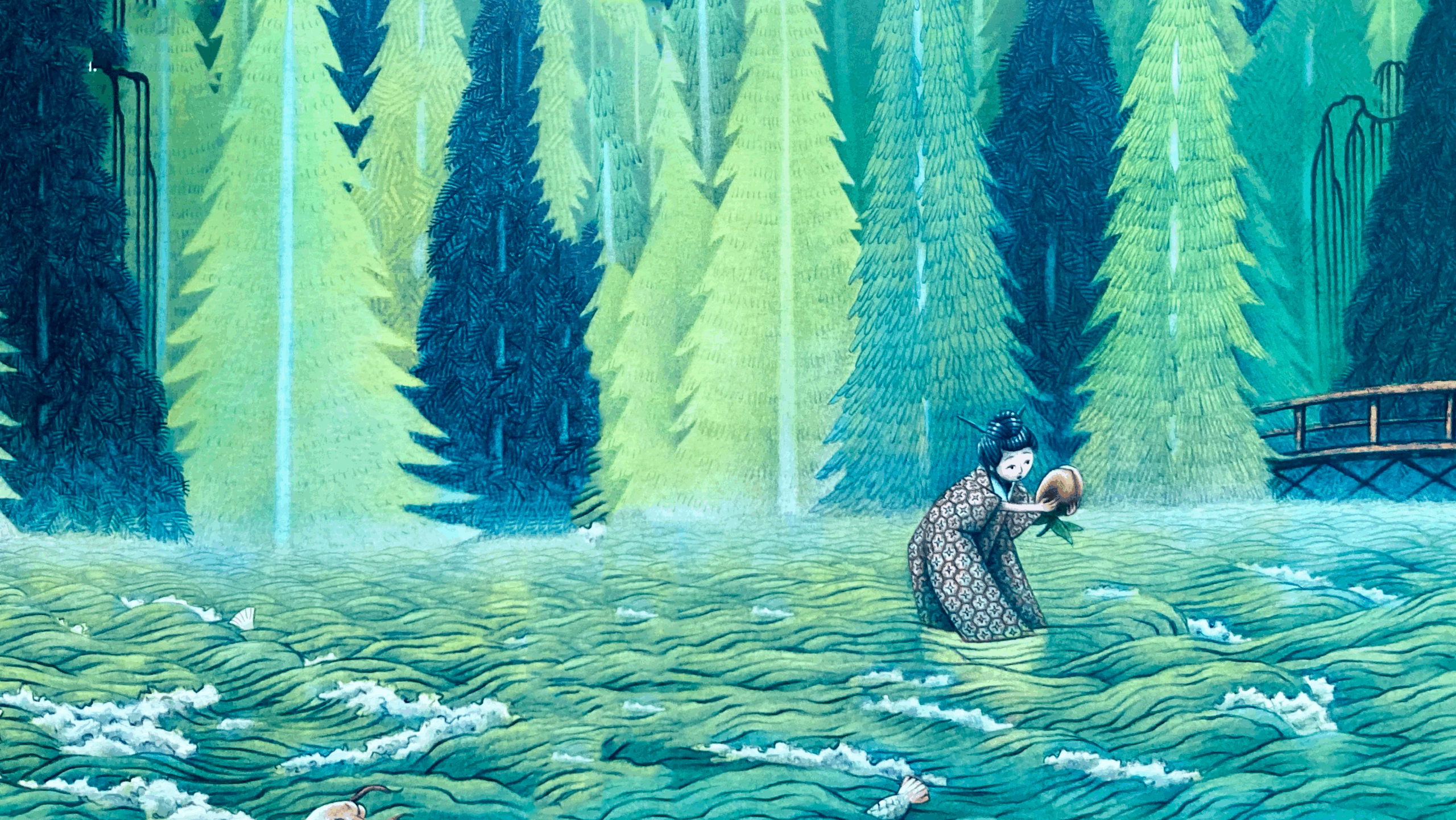 Il était une fois un vieux couple sans enfants. Un jour, la vieille femme trouva une grosse pêche flottant dans la rivière. En la ramenant chez elle et en l’ouvrant elle découvrit à l’intérieur un petit garçon en parfaite santé. Le couple émerveillé, l’adopta et l’appela « MOMOTARO », ce qui signifie « garçon pêche » en japonais.